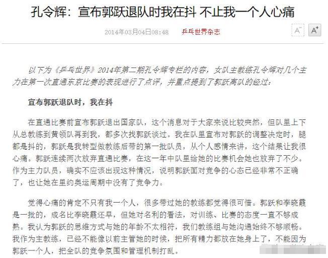 当时的主教练孔令辉更是直言:“郭跃在对待训练和比赛的态度一直很不成熟”。
